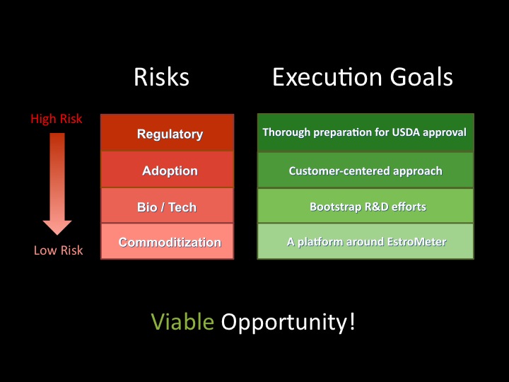 The cow estro meter could be done at lower risk using existing technology. Adapting what is already known, would fit on the competitive risks missing in the presentation.