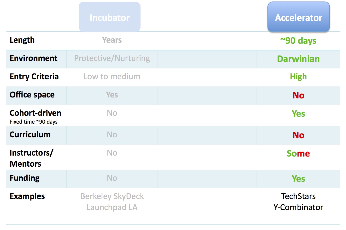 They may be privately run but often are non-profit, attached to a university or in some locations a local government. There is no formal “start date” so there is a no fixed time for their stay. (For some incubators, entrepreneurs can stay as long as they want.) There is no curriculum and seldom any formal instructors or mentors. There is no guaranteed funding. Think of incubators as “shelter from the storm.”